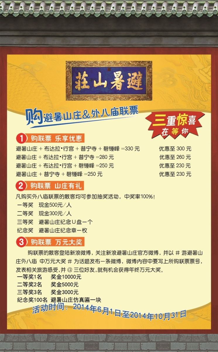 为了感谢广大游客对避暑山庄及周围寺庙景区的厚爱与支持,景区管委会将于2014年6月1日至10月31日针对购买景区联票(三联票、四联票)的散客,开展“购避暑山庄外八庙联票 中万元大奖”活动,以回馈广大游客。